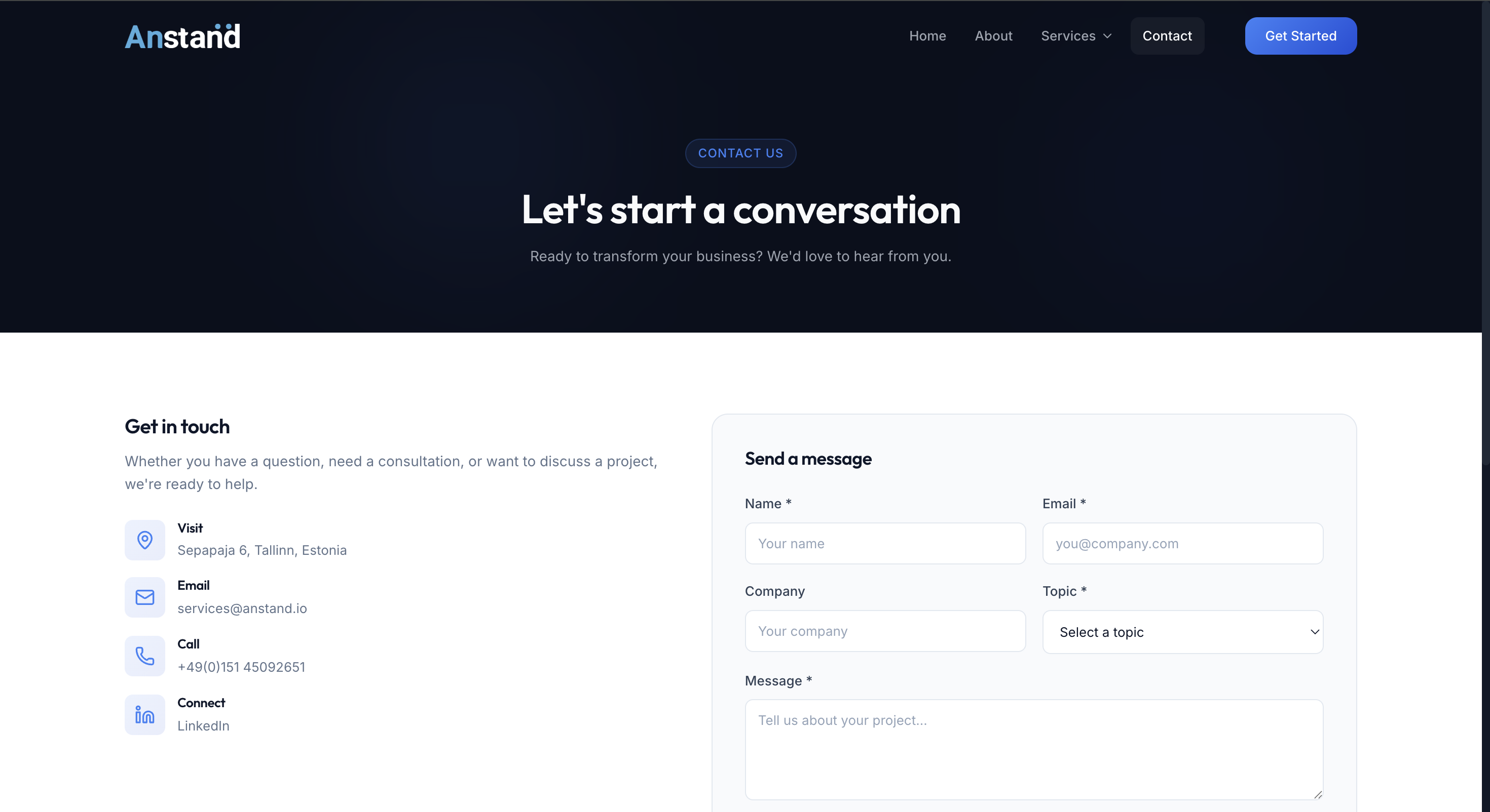 Anstand Analytics is a digital transformation consultancy operating across two continents, offering business analytics, process management, and resource outsourcing. Despite serious credentials and enterprise clients, they had no website. Decision-makers couldn't Google them, vet them, or reach out digitally. They needed a site that communicates authority instantly — the kind of presence that makes a procurement team confident enough to schedule a call.