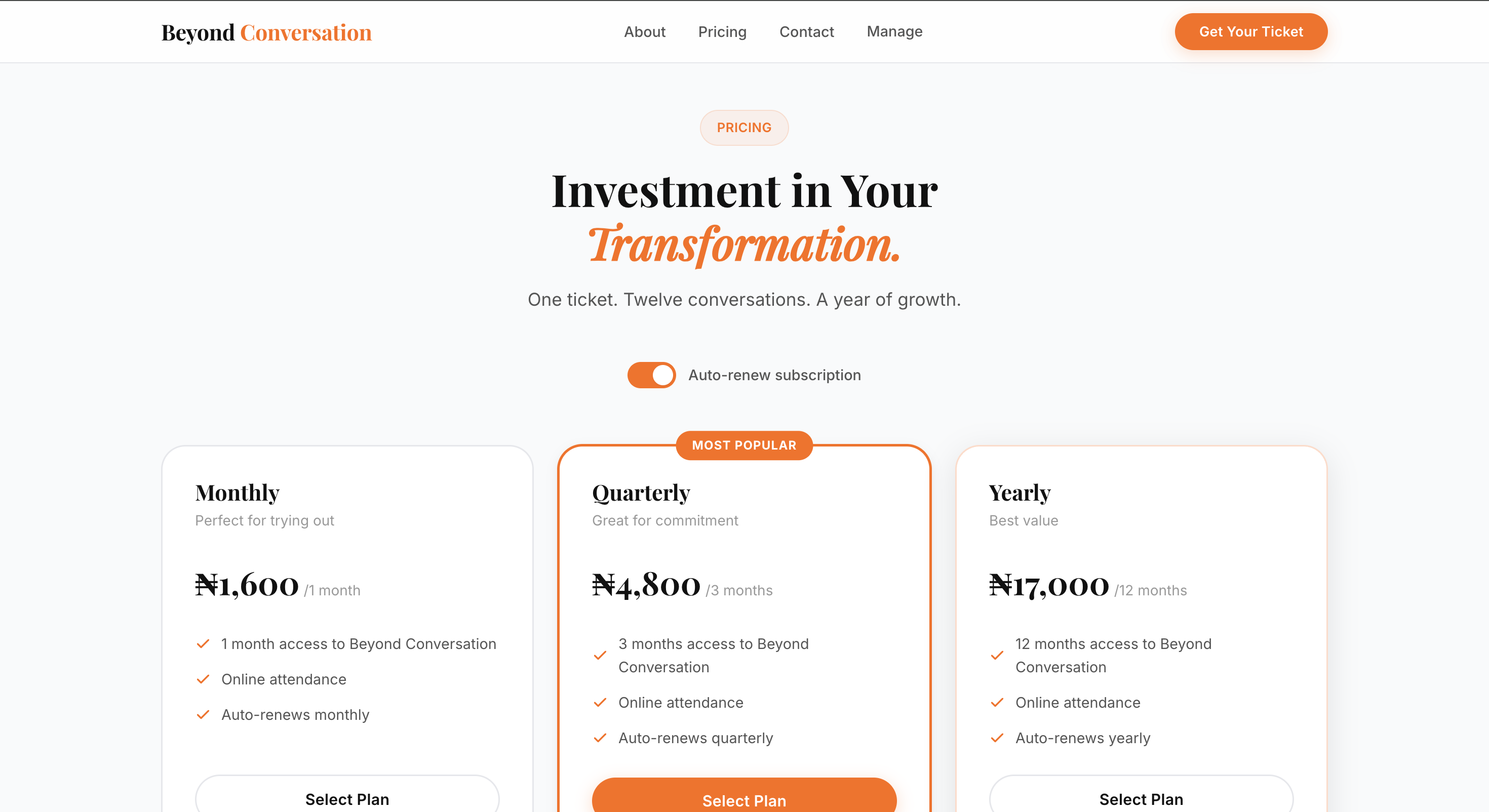 Instead of a typical event landing page, we created a narrative flow: bold hero → what you'll explore → why it matters → pricing → FAQ. Each section answers a buying objection. The pricing section handles three subscription tiers plus onsite tickets with a location picker — all connected to Paystack for real-time payments. We kept the design warm and editorial to match the conversational brand, while making sure every scroll moves visitors closer to checkout.